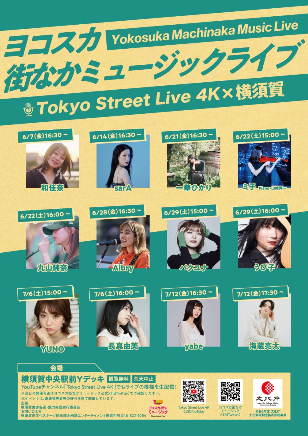 SNS等で注目の若手アーティストのライブ映像を配信するYouTubeチャンネル「Tokyo StreetLive 4K」(登録者数30 万人超)プロデュースによる「ヨコスカ街なかミュージックライブ」を、今年も横須賀中央駅前Y デッキで開催します。